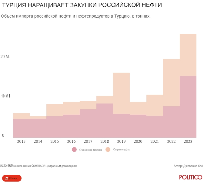 Это часть более широкой тенденции, согласно исследованиям Центра исследований энергетики и чистого воздуха (CREA) и Центра изучения демократии (CSD), а также независимым репортажам POLITICO. Российская нефть, похоже, массово поступает в ЕС через Турцию.
