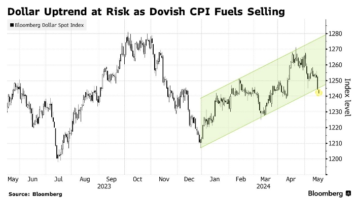 Индекс доллара США, рассчитываемый Bloomberg, упал до месячного минимума в четверг после опубликованного накануне отчета, который показал, что показатель базовой инфляции в США в апреле снизился впервые за шесть месяцев. Индекс готов к третьему дню потерь, и эта полоса может остановить общий восходящий тренд, который длится с начала года.