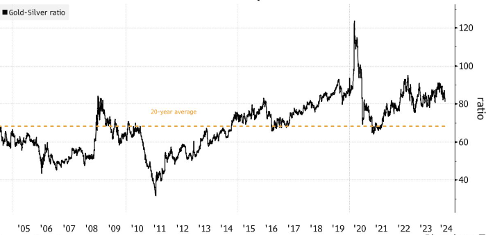 В 2024 году серебро подорожало почти на четверть, опередив золото по темпам роста и став одним из лучших по эффективности основных сырьевых товаров. Однако в относительном выражении серебро все еще остается недооцененным. В настоящее время для покупки 1 унции золота требуется около 80 унций серебра, что значительно выше среднего показателя за 20 лет на уровне 68.