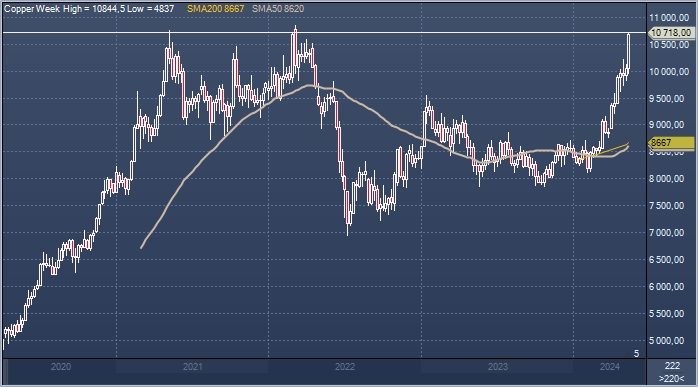Фьючерсные контракты на медь на Лондонской бирже металлов выросли в пятницу на 2,4%, достигнув исторического максимума, установленного в марте 2022 года. На этой неделе цены на медь в Нью-Йорке и Шанхае уже достигли рекордных значений, поскольку мировой рынок был взбудоражен кратковременным снижением цен на бирже Comex.