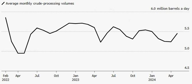 Среднемесячные объемы переработки нефти. Источник: Расчеты Bloomberg, основанные на отраслевых данных. Данные за май 2024 года относятся к первым 15 дням месяца.