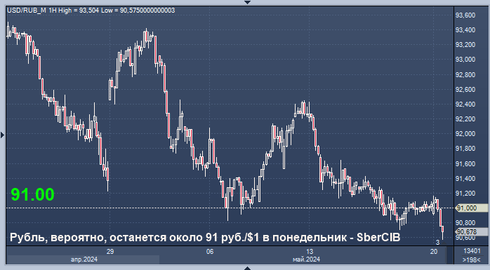 Рубль, вероятно, останется в понедельник около 91 руб./$1 в ожидании новых триггеров, полагают аналитики SberCIB Investment Research.