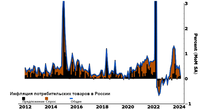 Давление со стороны спроса на товары в России остается умеренным. Источник: Росстат, Банк России, исследование Bloomberg Economics.