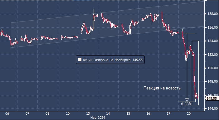 Акции «Газпрома» на Московской бирже падали в качестве реакции на новость на 6,5% и достигали минимума с октября 2022 года на уровне 145,03 рубля за бумагу.