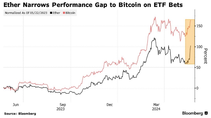 Эфир сокращает разрыв в прибыльности с биткойнами благодаря ожиданиям одобрения ETF. Источник: Блумберг