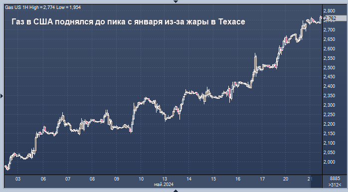 Фьючерсы на природный газ в США выросли на фоне жары в начале сезона в Техасе, небольших показателей добычи по сравнению с прошлым годом и меньших, чем ожидалось, объемов газа в хранилищах. Все это ослабляют некоторые опасения по поводу рынка, который был значительно перенасыщен предложением после того, как необычно мягкая зима снизила спрос. Фьючерсы на поставку в июне выросли вчера на +12,5 цента, или +4,8%, до $2,751/млн БТЕ на Nymex. Сейчас на электронной сессии котировки прибавляют еще 20 центов. Цены выщли на самый высокий уровень с 17 января.