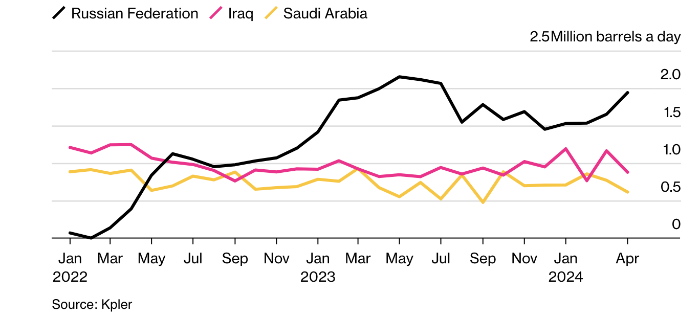 Индия остается крупнейшим покупателем российскойнефти, поставляемой по морю. Источник: Bloomberg