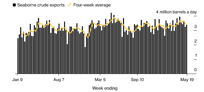 Цель России по экспорту на этот месяц более удобная, чем в апреле, поскольку Кремль отходит от ограничений на зарубежные поставки и переходит к более глубоким сокращениям добычи, которые показатели в соответствии с планами. Министры нефти ОПЕК+ должны собраться 1 июня, чтобы обсудить политику добычи, и ожидается, что Россия вместе с несколькими другими членами группы примет решение о продлении дополнительных добровольных сокращений добычи на третий квартал.
