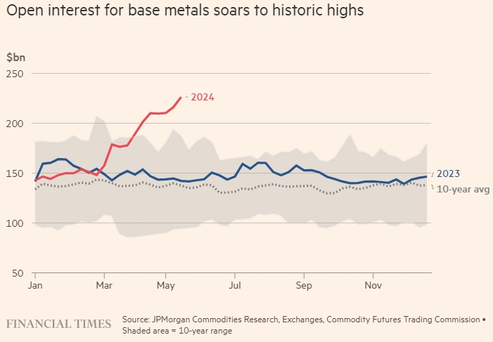 Открытый интерес по цветным металлам взлетел до исторического максимума. ФТ. Источник: JPMorgan Commodities Research, биржи, Комиссия по торговле товарными фьючерсами