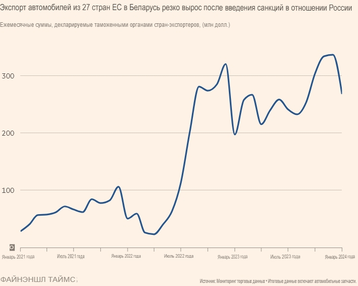 Ежемесячный поток автомобилей и запчастей к ним из стран ЕС в Беларусь вырос с $50 млн в январе 2022 года до $268 млн в январе 2024 года. В настоящее время это крупнейший компонент экспорта между ЕС и Беларусью, который в основном поступает из Германии и Польши.