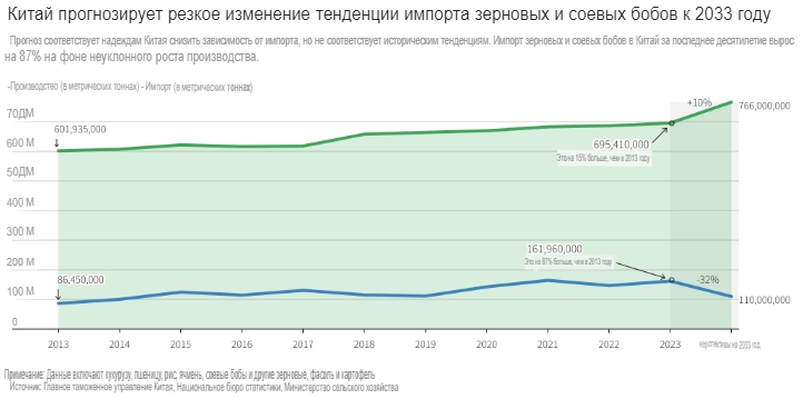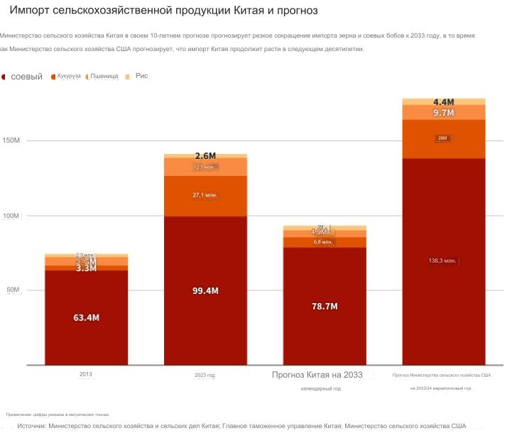 Что касается соевых бобов, самой большой статьи расходов на импорт сельскохозяйственной продукции, который в прошлом году составил 234 миллиарда долларов, то Пекин ожидает, что за десятилетие импорт сократится на 21% до 78,7 миллиона тонн.