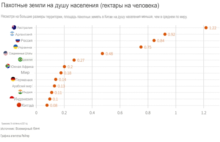 Пахотные земли на душу населения в Китае составляют менее одной трети от уровня Бразилии и одной шестой от уровня США, свидетельствуют данные Всемирного банка за 2021 год.