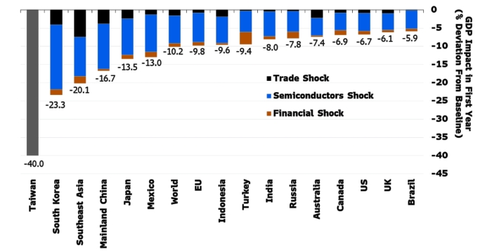 Основываясь на исторической выборке стран, которые подверглись вторжению или оккупации за последние 100 лет, мы подсчитали, что ВВП Тайваня сократится как минимум на 40% в течение первого года войны. Тайвань, вероятно, пострадает больше других, поскольку он уязвим для блокады и сильно зависит от торговли.
