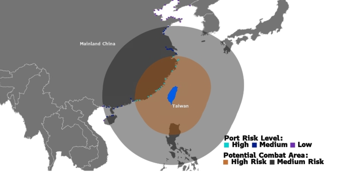 Мы оценили минимальную зону боевых действий, исходя из дальности действия тайваньских ракет. Хотя Тайбэй, вероятно, не стал бы намеренно наносить удары по коммерческой инфраструктуре или кораблям, он, скорее всего, попытался бы заблокировать китайские порты до того, как силы вторжения отправятся на борт кораблей, и оградить Тайвань от любых потенциальных угроз. Эта возможная зона боевых действий охватывает 41 китайский порт, через который ежегодно осуществляется товарооборот на сумму 2,6 трлн долларов.