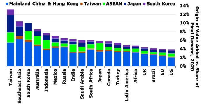 Источник: OECD Trade in Value Added, Bloomberg Economics. Примечание: Без учета внутренней добавленной стоимости.