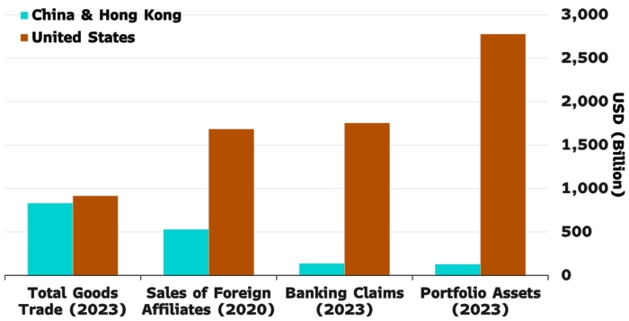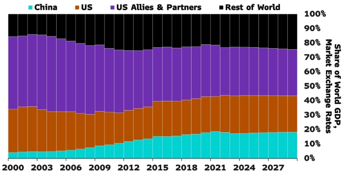 Источник: Обзор мировой экономики МВФ (апрель 2024 г.), Bloomberg Economics. Примечание: Союзники и партнеры США определяются на основе доли торговли, договорных отношений и наших суждений. Мы относим Австралию, Канаду, Европейскую ассоциацию свободной торговли, Европейский союз, Японию, Мексику, Южную Корею и Великобританию к союзникам и партнерам США.