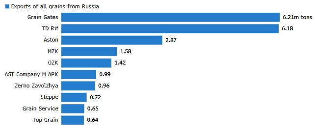 Консолидация усилилась после начала российско-украинского конфликта, и теперь только четыре компании отвечают за три четверти экспорта зерна с российских черноморских терминалов. Это дает российской власти больше влияния на поставки пшеницы, которые сыграли ключевую роль в сдерживании глобальной продовольственной инфляции. Это также затрудняет зарубежным трейдерам получение информации о поставках пшеницы в Россию — в то время как плохая погода негативно сказывается на урожае пшеницы в России и пугает рынок.