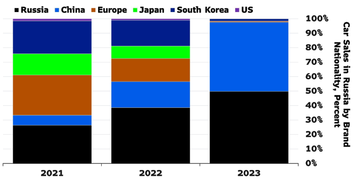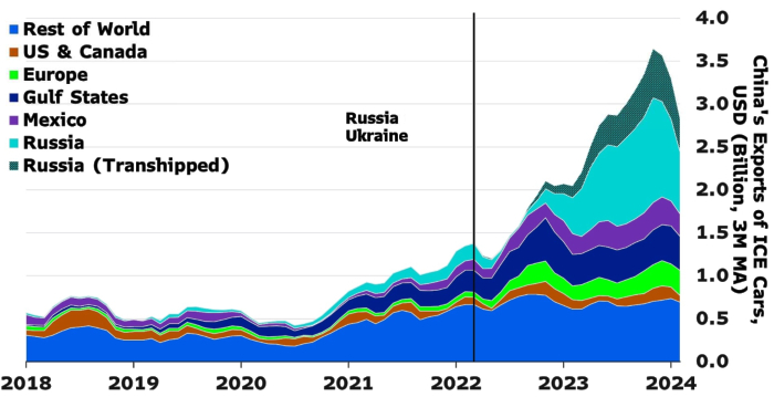 Резкий рост китайского экспорта автомобилей с ДВС во многом обусловлен одной страной — Россией. По оценкам Bloomberg Economics, 58% прироста китайского экспорта автомобилей с ДВС в стоимостном выражении в 2023 году по сравнению с 2021 годом приходится на российский спрос. При этом учитывались вероятные поставки через такие страны, как Казахстан, Кыргызстан и Турция, оценивая «избыточный импорт» автомобилей с ДВС, то есть объем импорта, превышающий исторические тенденции и уровни, соответствующие макроэкономическим переменным.
