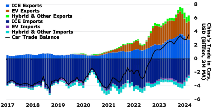 Китай быстро превратился из нетто-импортера автомобилей в нетто-экспортера. Электромобили — предмет озабоченности правительств США и ЕС — являются важной частью этого перехода. Но на традиционные автомобили с ДВС приходится почти такая же доля китайского автомобильного экспорта, который увеличился с 2021 года.