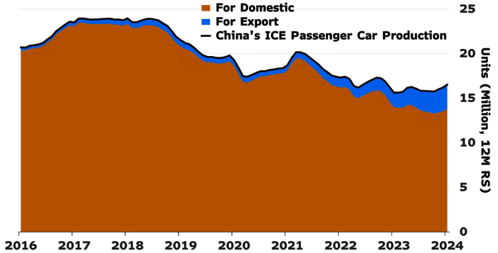 Спрос на автомобили с ДВС в Китае достиг своего пика в 2017 году, когда потребители перешли на электромобили. Избыточные производственные мощности Китая по производству автомобилей с ДВС, вероятно, являются гораздо большей проблемой, чем избыточные мощности по производству электромобилей, хотя западные страны, как правило, уделяют особое внимание последнему.