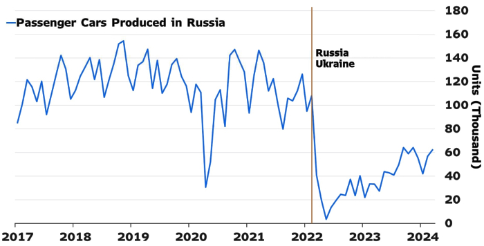 Отчасти российские потребители отреагировали на это тем, что стали покупать меньше новых автомобилей: количество покупок сократилось с 1,7 млн в 2021 году до примерно 937 000 в 2023 году. Но они также скорректировались, переключившись почти исключительно на отечественные и китайские бренды. До 2022 года на европейские, японские, южнокорейские и американские автомобильные бренды приходилось 67% продаж в 2021 году, но к 2023 году их совокупная доля практически сошла на нет. Доля китайских брендов выросла с 7% в 2021 году до 48% в 2023 году.