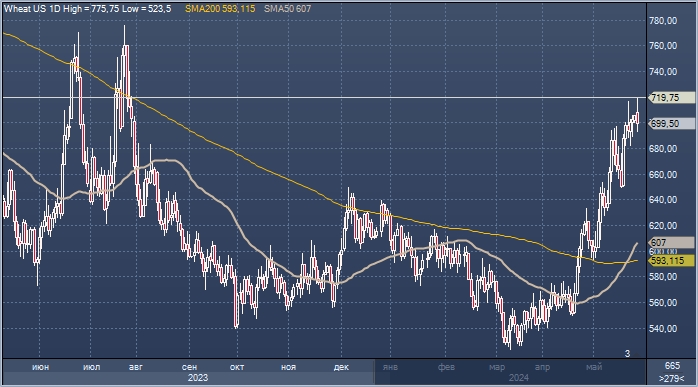 Министерство сельского хозяйства США прогнозирует, что мировые запасы пшеницы в предстоящем сезоне могут упасть до девятилетнего минимума, и хедж-фонды сокращают ставки на американском рынке. Фьючерсы на пшеницу в Париже также растут, достигнув максимума с марта 2023 года.