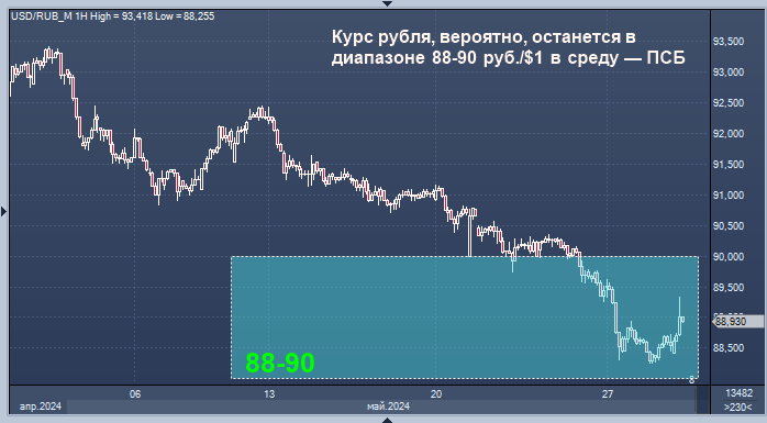 Курс валютной пары доллар/рубль, вероятно, останется в диапазоне 88-90 руб./$1 в течение торговой сессии среды с возможным переходом в его верхнюю часть, спекулятивные участники закладываются на дальнейшее снижение активности экспортеров, говорится в комментарии начальника отдела экономического и отраслевого анализа Промсвязьбанка (ПСБ) Евгения Локтюхова.