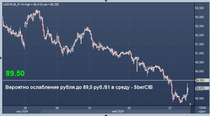 Вероятно ослабление рубля до 89,5 руб./$1 в среду, отмечается в комментарии аналитиков SberCIB Investment Research.