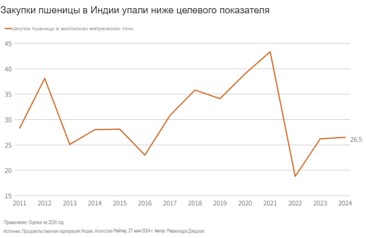 С начала сбора урожая в апреле правительству удалось закупить только 26,2 миллиона метрических тонн при целевом показателе в 30-32 миллиона.