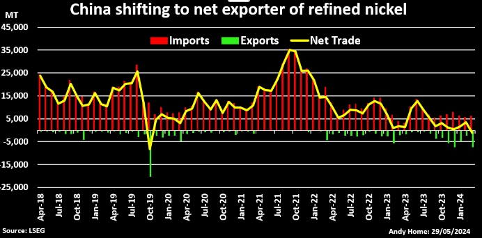 Чистый импорт рафинированного никеля в Китай упал с 256 000 тонн в 2021 году до 133 000 тонн в 2022 году и всего до 55 000 тонн в 2023 году.