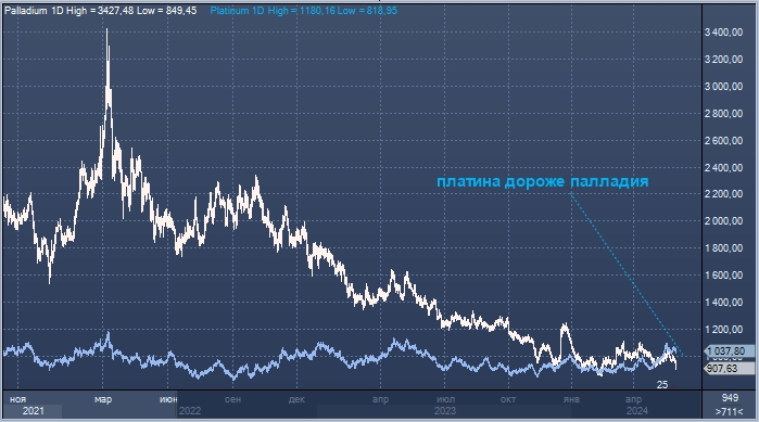 График цен на палладий и платину интервалами в 1 день.