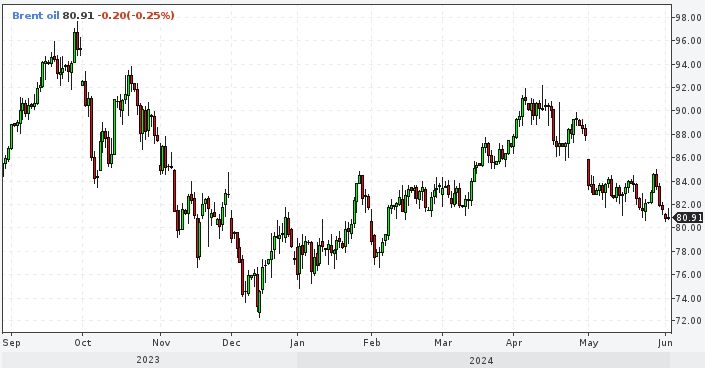 Августовские фьючерсы на нефть Brent в понедельник, 3 июня, подешевели на 0,43%, до $80,77 за баррель.