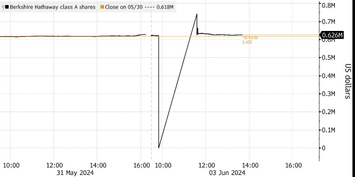Более десяти сделок с акциями Berkshire Class A были совершены по цене $185,10 около 9:50 утра. Акции закрылись в пятницу по цене $627 400. NYSE сообщила, что любая сделка между 9:50 и 9:51 по цене $603 718,30 или ниже будет аннулирована. У компании NuScale Power Corp. произошел аналогичный сбой, со сделками, показывающими падение примерно на 99% от предыдущей цены.