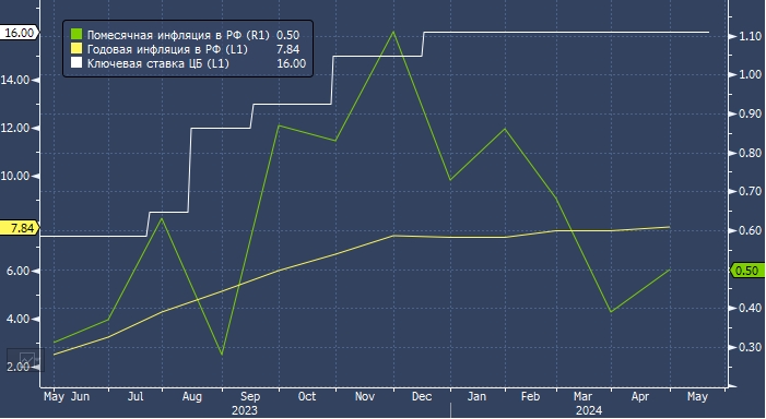 "Основным событием текущей недели станет заседание Банка России по ключевой ставке. С момента предыдущего вероятность ее подъема заметно повысилась. В пользу такого варианта свидетельствуют сохранение повышенной экономической, потребительской и кредитной активности, а также отсутствие устойчивого тренда замедления инфляции и нестабильность инфляционных ожиданий населения. Проинфляционные риски поддерживаются такими факторами, как летняя индексация тарифов, гибель урожая из-за заморозков, а также возможное сокращение предложения импорта из-за сложностей во внешних расчетах за него. Кроме того, сама риторика представителей ЦБ за последнее время заметно ужесточилась. Фактические денежно-кредитные условия на рынке продолжают ужесточаться, отражая соответствующие ожидания участников, - пишет эксперт в обзоре. - Однако повышать ставку было бы логично на опорном заседании в конце июля вместе с изменением макропрогноза. Ожидаем, что 7 июня регулятор сохранит ставку на уровне 16%, но вместе с тем ужесточит риторику и просигнализирует рынку таким образом, что ожидания начала смягчения процентной политики могут полностью сместиться на 2025 год".