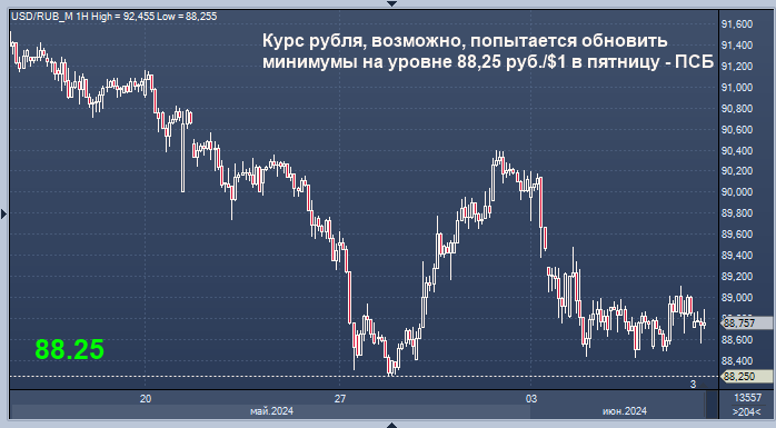 Курс пары доллар/рубль в целом, вероятно, останется в пятницу в торговом диапазоне 88-89 руб./$1 с попытками обновить майские минимумы на уровне 88,25 руб./$1, считает начальник отдела экономического и отраслевого анализа Промсвязьбанка (ПСБ) Евгений Локтюхов.