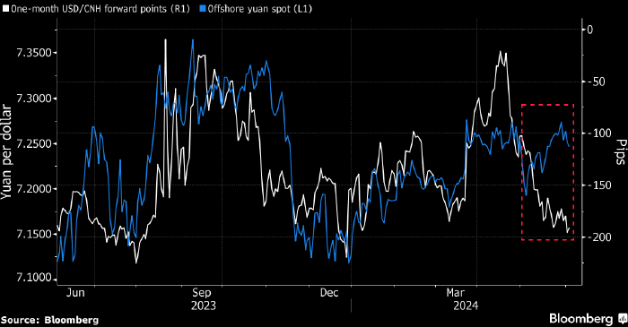 Значительное увеличение юаневой ликвидности на офшорном рынке подогревает спекуляции на тему того, что Банк Китая намеренно ослабляет свою хватку, создавая предпосылки для ослабления национальной валюты. На этом фоне стоимость продажи офшорного юаня (CNH) против доллара с помощью одномесячных форвардов опустилась до самого низкого значения в этом году.