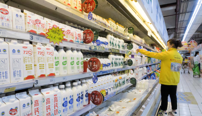 Сотрудник расставляет коробки с молоком на полках холодильника в супермаркете в Пекине, Китай, 21 мая 2021 года. REUTERS/Thomas Peter