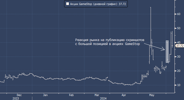 В четверг (6 июня) на Youtube-канале Кита Гилла, также известного как RoaringKitty*, появился анонс проведения стриминговой трансляции в пятницу днем по Нью-Йорку (первой почти за четыре последних года). На этом фоне акции GameStop — участникам рынка не потребовалось объяснять, о чем именно пойдет речь — закрыли сессию понедельника ростом на 47%.