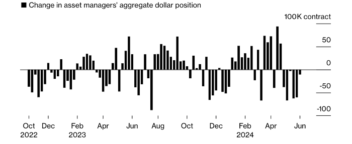 Изменения агрегированной позиции управляющих активами по доллару США. Источник Bloomberg