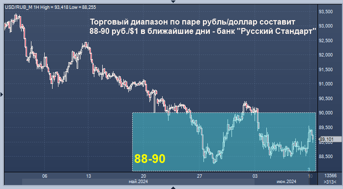 Торговый диапазон по паре рубль/доллар, скорее всего, составит в ближайшие дни 88-90 руб./$1, по паре рубль/евро - 96-98 руб./EUR1, полагает директор департамента операций на финансовых рынках банка "Русский Стандарт" Максим Тимошенко.