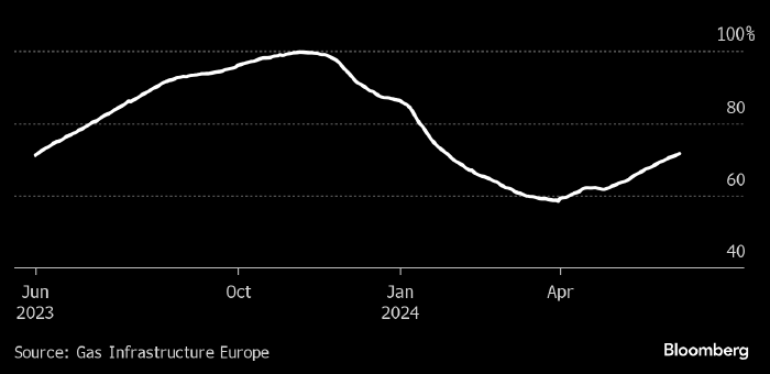 Заполненность европейских хранилищ природного газа. Источник: Bloomberg