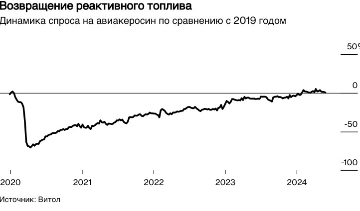 Возвращение реактивного топлива. Динамика спроса на авиационное топливо по сравнению с 2019 годом. Источник: Vitol