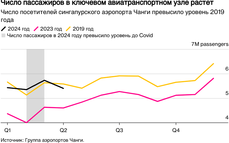 В Сингапуре, еще одном перевалочном пункте между Азией и Западом, количество пассажиров в аэропорту Чанги за первые три месяца 2024 года - 16,5 миллиона человек - превысило уровень 2019 года. После введения 30-дневного безвизового режима между двумя странами Китай стал главным направлением аэропорта в этом квартале.