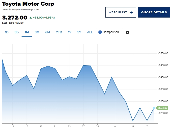 Акции крупнейшего японского автопроизводителя Toyota упали более чем на 5,4% на прошлой неделе, после того как 3 июня разразился скандал, но в понедельник восстановились. Только за прошлую неделю автопроизводитель потерял 2,45 триллиона японских иен (15,62 миллиарда долларов) в рыночной стоимости.