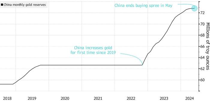 Центральный банк Китая не приобретал золото в прошлом месяце, положив конец серии масштабных покупок, которая помогла поднять цены на драгоценный металл до рекордного уровня в мае. Банк регулярно пополнял резервы с ноября 2022 года, возглавив тренд, в рамках которого центральные банки мира скупали золото на фоне растущей геополитической напряженности. Появились признаки охлаждения спроса со стороны Китая, предположительно, из-за высоких цен. Риск для быков по золоту заключается в том, что ненасытный аппетит Китая сделал драгоценный металл уязвимым к любому потенциальному изменению спроса.