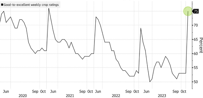 Урожай кукурузы в США показывает лучший старт за три года: 75% полей находятся в хорошем или отличном состоянии. Обильные осадки и не слишком высокие температуры способствовали росту всходов, даже несмотря на то, что некоторые фермеры жаловались на переувлажненную почву. Трейдеры в среднем ожидают, что Министерство сельского хозяйства США внесет мало изменений в свой прогноз по производству кукурузы в США. Отчет о состоянии мирового рынка сельскохозяйственной продукции будет опубликован в среду.