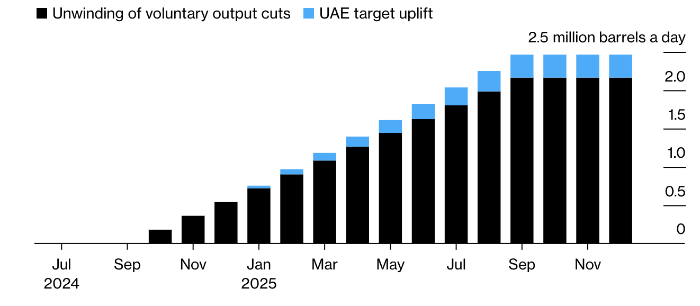 Министры группы стран-производителей нефти ОПЕК+ объявили о планах увеличить добычу почти на 2.5 млн баррелей в день к октябрю 2025 года. Увеличение должно произойти за счет отказа от последнего раунда сокращения добычи. Кроме того, Объединенным Арабским Эмиратам разрешат немного увеличить целевой показатель добычи. Цены на нефть упали на 5% после объявления, при этом министры настаивали на том, что могут передумать, если рыночные условия изменятся.