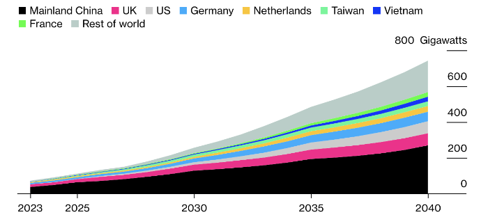 Прирост офшорной ветроэнергетики может обновить максимум в этом году, поскольку несколько новых рынков, включая США, Францию и Тайвань, наращивают использование энергии ветра. По данным BloombergNEF, в 2024 году будет введено в эксплуатацию 18,3 гигаватт офшорных ветровых мощностей, что станет новым рекордом. Этот рубеж будет достигнут на фоне ожидаемого бума офшорных ветровых аукционов, поддерживающих траекторию уверенного роста, и к 2040 году мощность должна увеличиться в 10 раз и достичь 742 гигаватт.
