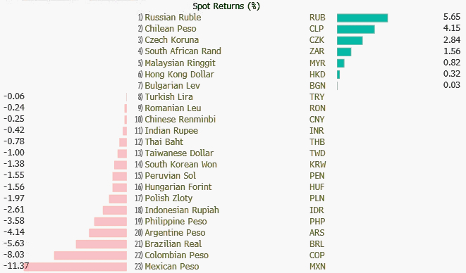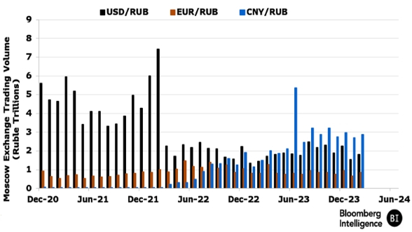 Санкции Министерства финансов США против Московской биржи (MOEX), введенные 12 июня, вызвали резкий скачок наличного курса доллара по отношению к рублю, когда межбанковский рынок был закрыт из-за праздника в РФ. Торги долларом, евро и гонконгским долларом были приостановлены на Московской бирже с 13 июля, но продолжатся на внебиржевом рынке (на который в настоящее время приходится более 50% от общего объема валютных торгов в России). Доля торгов в паре юань-рубль на Московской бирже достигла рекордно высокого уровня в 53,6% в мае по сравнению с долей 45,9% валют недружественных стран (включая доллар и евро).