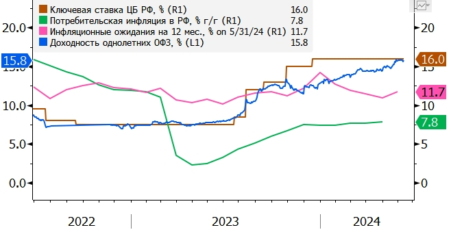 Несмотря на признаки сохраняющегося перегрева, Банк России на своем заседании 7 июня оставил ключевую ставку на прежнем уровне 16%, хотя и занял еще более жесткую позицию. Он объяснил паузу ужесточением денежно-кредитных условий после последнего заседания в апреле, включая рост на 120–170 б.п. доходностей ОФЗ и на 80–220 б.п. долгосрочных ставок денежного рынка. Если не произойдет скорого снижения инфляции, ЦБ РФ, похоже, повысит ставку 26 июля.